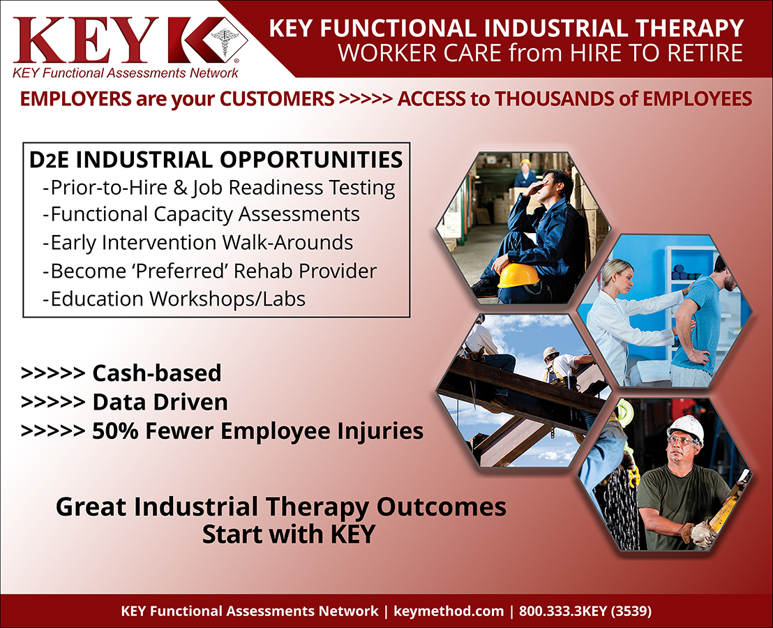 Support and Guidance from Industry Leaders: KEY Functional Assessments, a pioneer in Industrial Therapy, offers a clear path forward. With guidance on design, structure, sales, marketing, and delivery. Step into this next chapter with speed and confidence. Integrate services that protect workers and establish you as THE trusted, essential care provider not just for Employees, but for their families too.